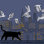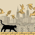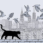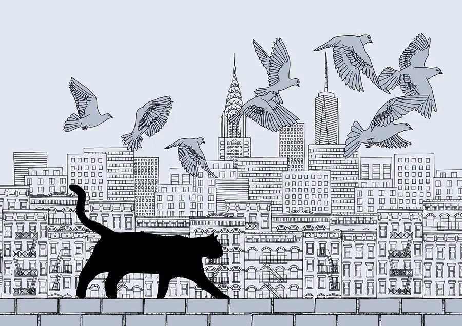 Fotótapéta Macska sétál a falon, madarak repülnek az égen