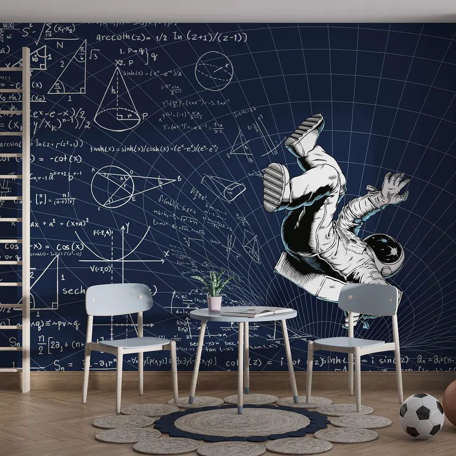 Fotótapéta Ember űrruhában, aki matematikai egyenleteket tartalmazó táblára esik