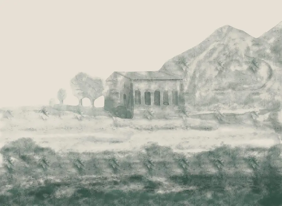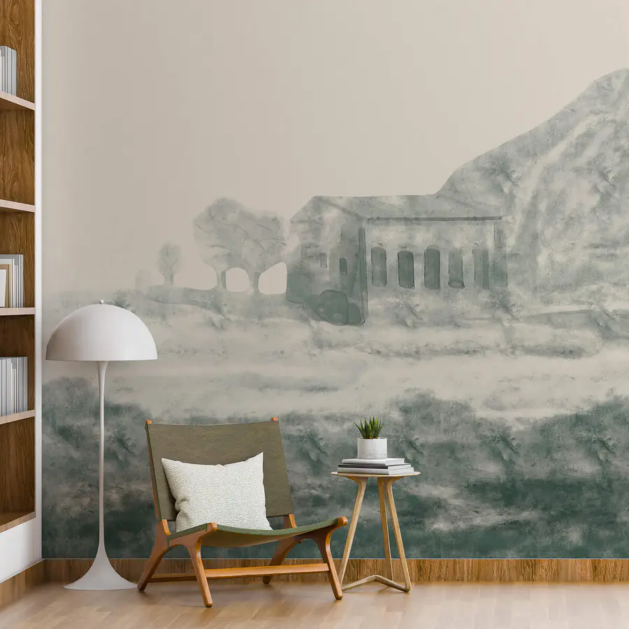Fotótapéta Épület és hegy festménye