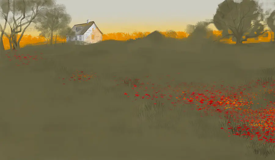 Fotótapéta Vörös virágok mezeje háttérben egy házzal