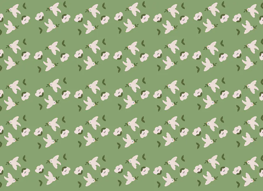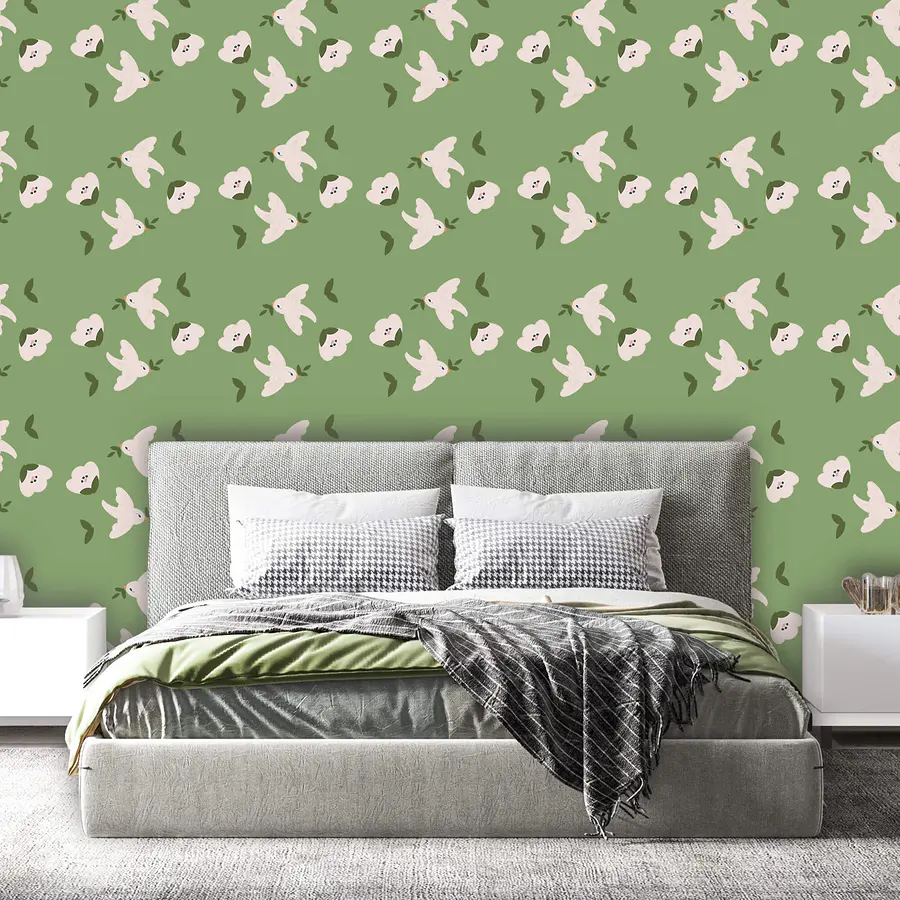 Fotótapéta Fehér madarak és zöld levelek mintája