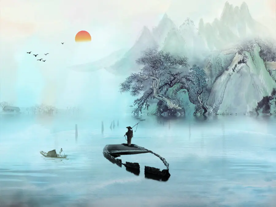 Fotótapéta Férfi áll egy csónakban a vízben, hegyekkel és fákkal