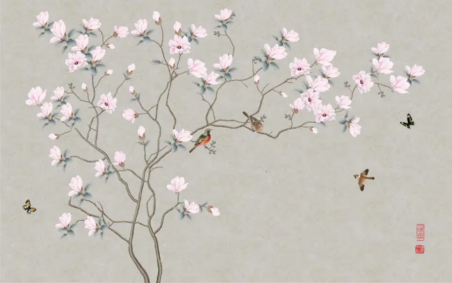 Fotótapéta Fa virágokkal és madarakkal