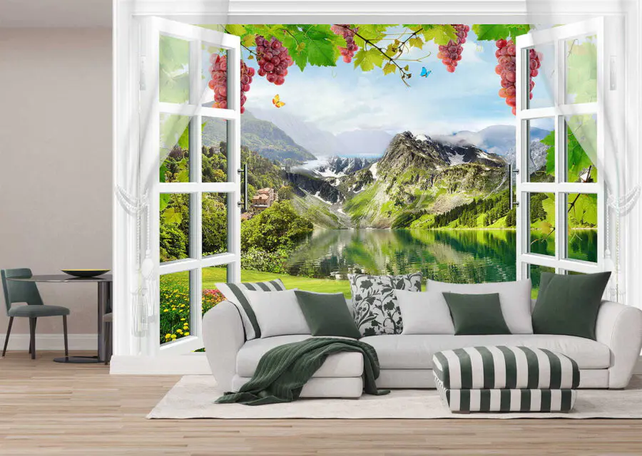 Fotótapéta Ablak, kilátással a tóra és a hegyekre