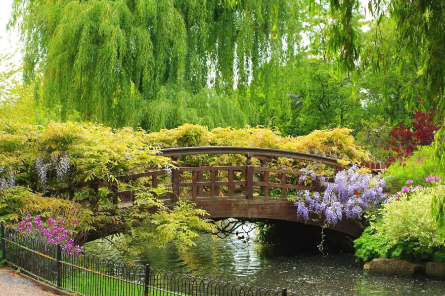 Fotótapéta Híd a víz felett fákkal és növényekkel