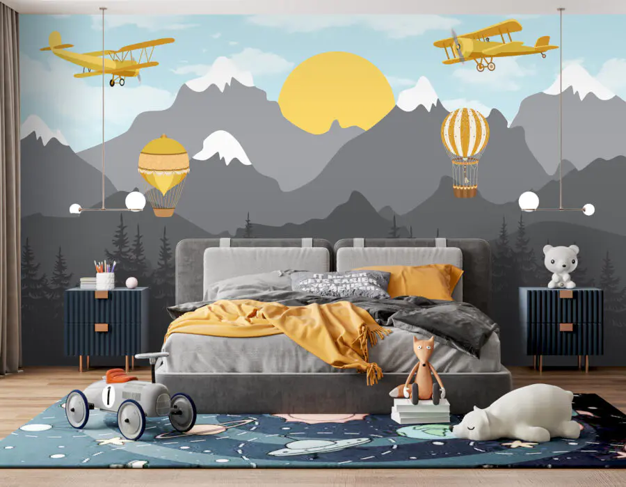 5331.23 Ft2932.18 FtFotótapéta Falfestmény repülőgépekről és hőlégballonokról, amelyek a hegyek felett repülnek