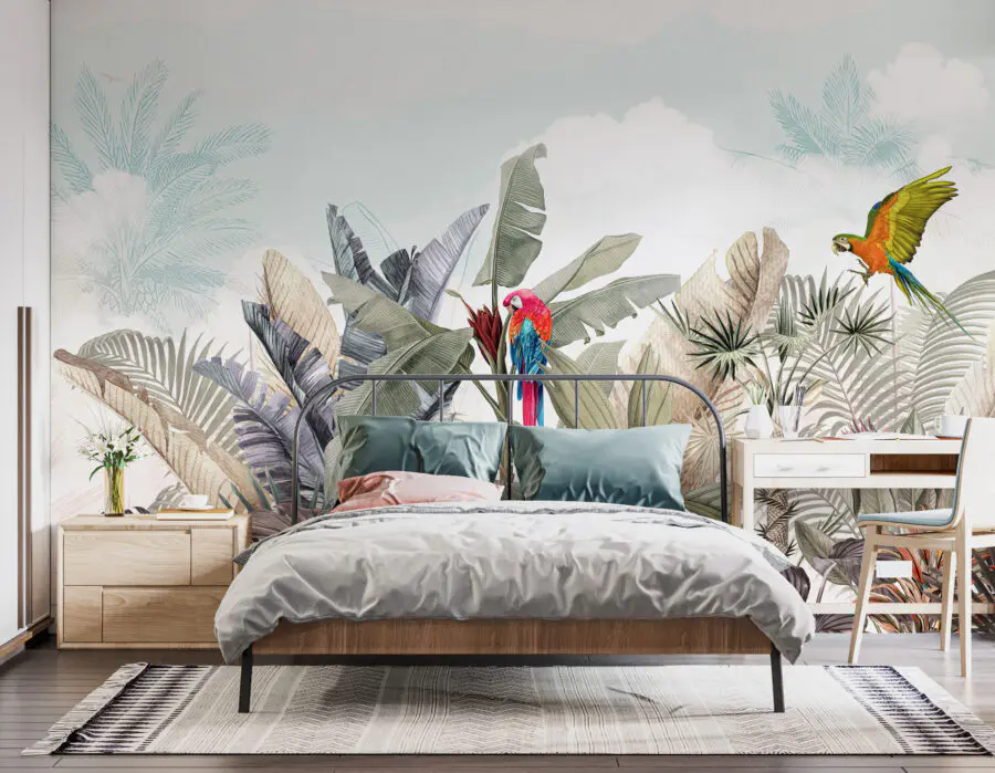 Fotótapéta Tapéta trópusi növényekkel és madarakkal
