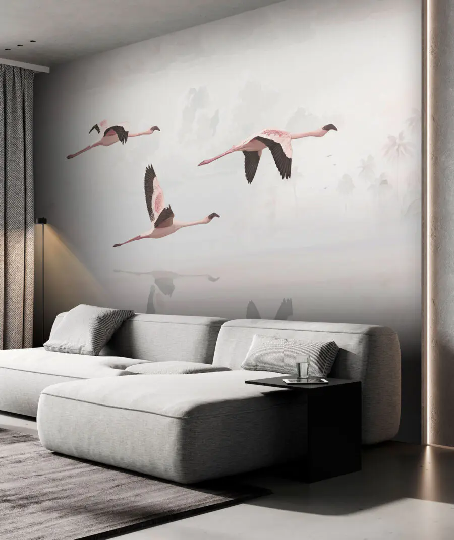 Fotótapéta Egy csapat flamingó repül a víz felett