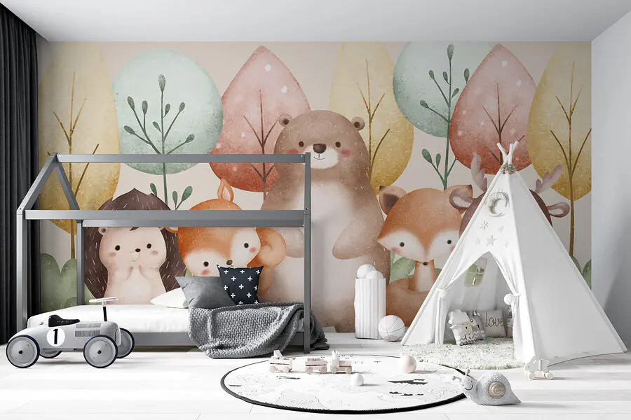 Sziasztok! Nézd meg ezt az elbűvölő falfestményt, "Állatok csoportja az erdőben". Olyan, mintha egy hangulatos erdei mesekönyvbe csöppentél volna, egyenesen a saját helyeden. Képzelj el egy csomó imádnivaló állatot - gondolj a bolyhos mókusokra és egy medvére, amely valószínűleg a legjobban ölelkezik - puha pasztellszínű fák között. Tökéletes a gyerekszobába vagy bármely olyan helyiségbe, ahol egy kis szeszélyre van szükség. Képzeld el, milyen öröm lenne minden reggel erre a jelenetre ébredni! Ez a természet bájjal teli szelete, amely minden falat karakteressé varázsol.