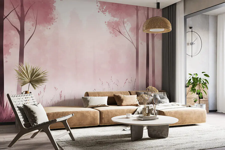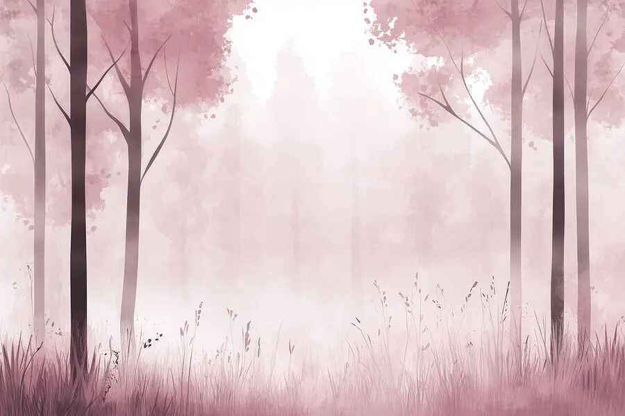 Fotótapéta Ködös erdő rózsaszín fákkal