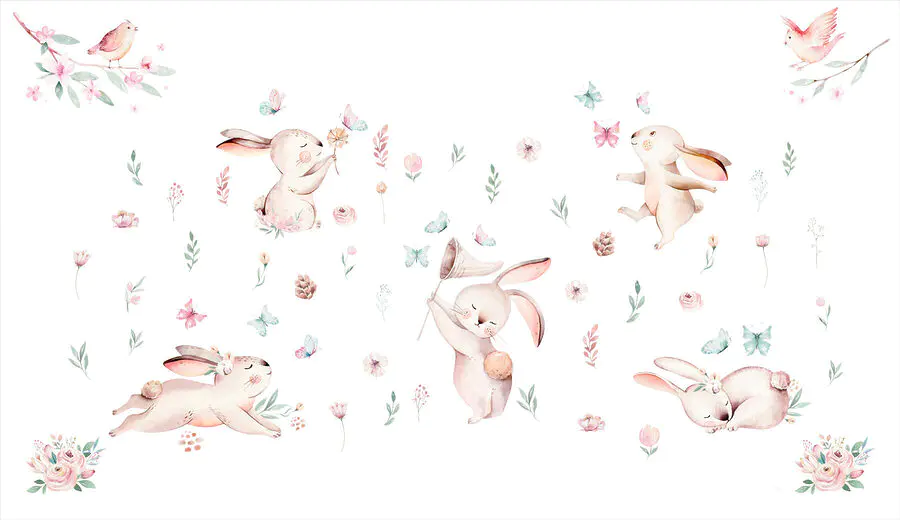 Fotótapéta Nyulak csoportja virágokkal és pillangókkal