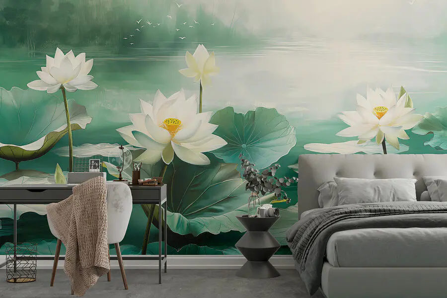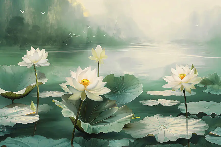 Fotótapéta Festmény fehér virágok és levelek egy tóban