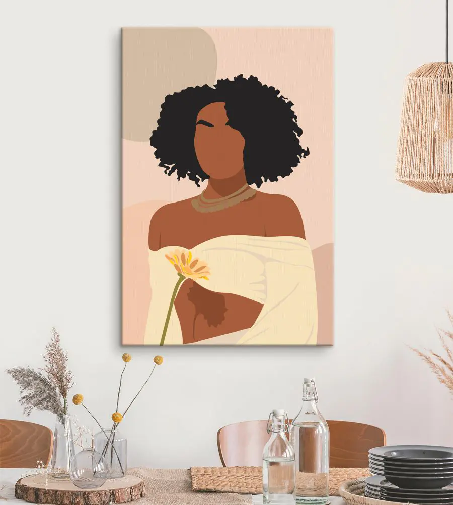 Képzeld el, hogy belépsz egy szobába, és ez a lenyűgöző vászonnyomat fogad, amelyen egy göndör hajú, virággal díszített nő látható. Mintha a szelíd erő és a játékosság tökéletes pillanatában lenne elkapva. Komolyan, a fürtjei mintha saját életet élnének! Ez a darab nem csupán fali dekoráció; ez egy olyan művészeti csobbanás, amely az elegancia és a melegség történeteit suttogja a szoba másik végéből. Tökéletes a művészet szerelmeseinek vagy bárkinek, aki egy kis bájt szeretne hozzáadni - mert kinek nincs szüksége egy kis személyiségre a falán?