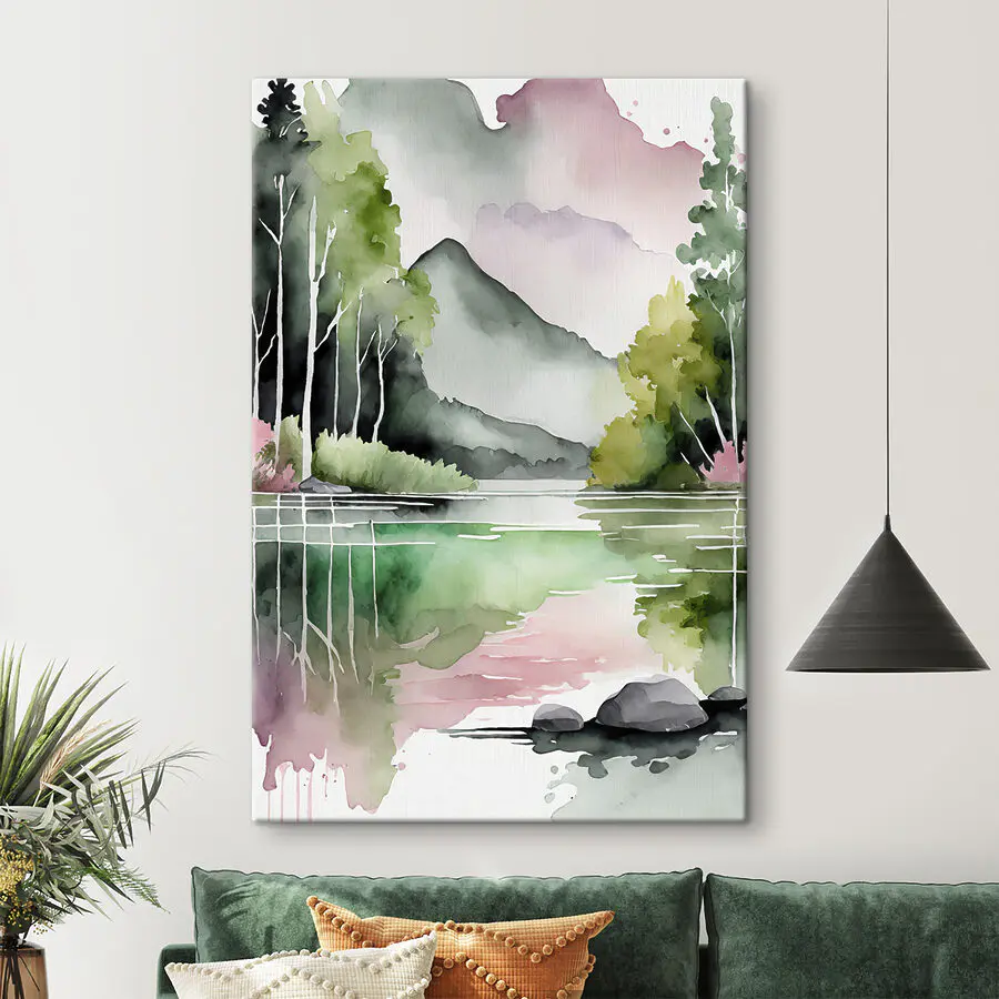 Vászonképek Akvarell festmény egy tó fákkal és hegyekkel a háttérben