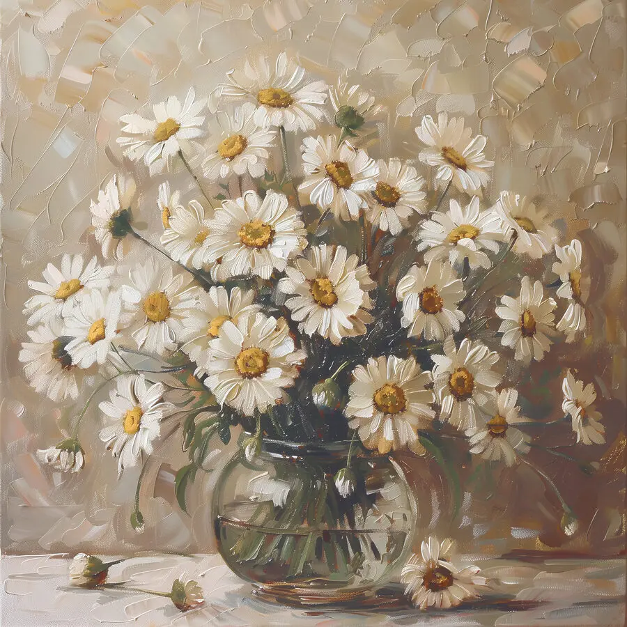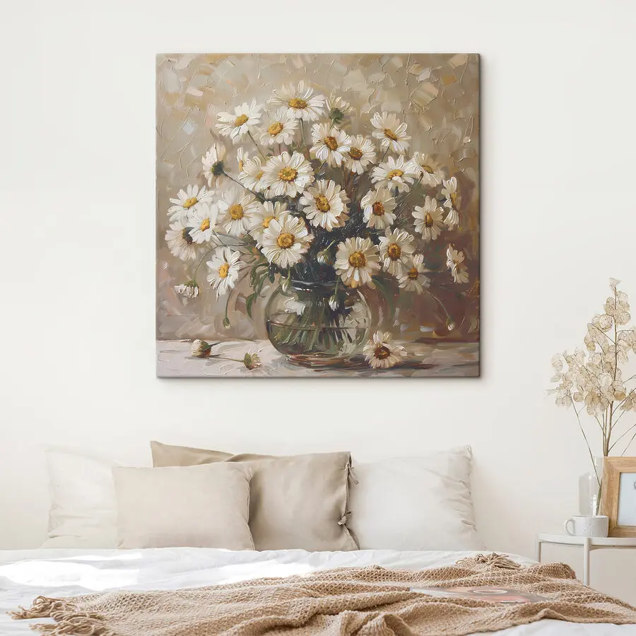 Kedveli a virágokat? Ez a vászonnyomat egy vidám virágokkal teli váza időtlen szépségét örökíti meg - ezek a százszorszépek alapvetően azt kiáltják, hogy "csak jó hangulatot!". Egy kis természet varázsa közvetlenül a lakótérben, öntözés nélkül. Képzeld el ezt a műalkotást a faladon: feldobja az unalmas sarkokat, és a nyugalom és a boldogság érzését terjeszti. Tökéletes azok számára, akik imádják a klasszikus, természetes szépséget egy kis hangulatos nosztalgiával. Ráadásul egy csipetnyi kifinomultságot is ad - mert kinek ne lenne szüksége még többre?