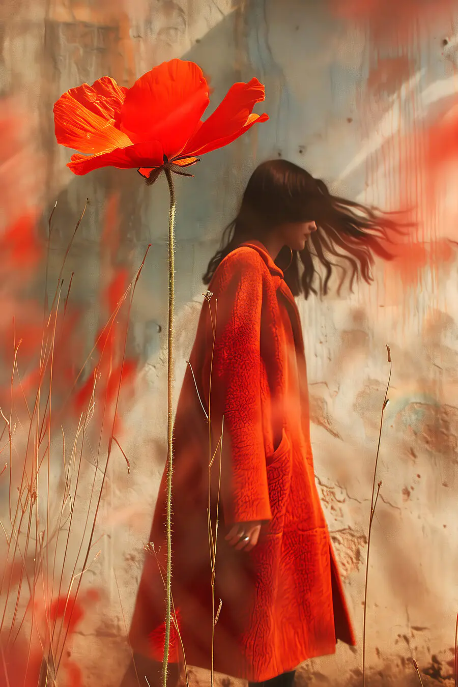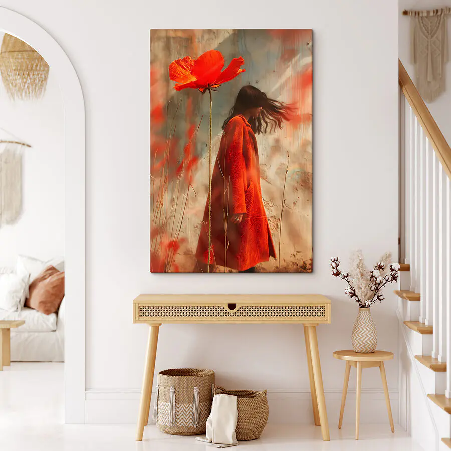 Vászonképek Nő piros kabátban és egy nagy virággal