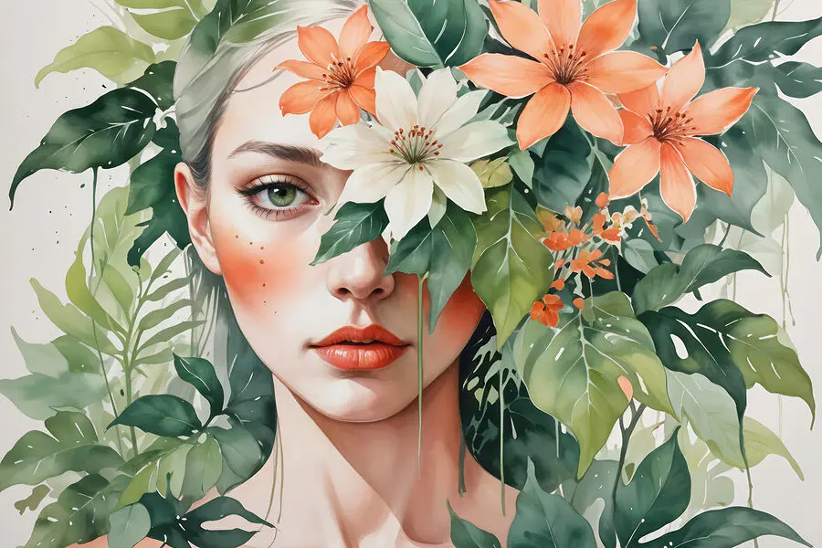 Vászonképek Nő virágokkal az arca körül