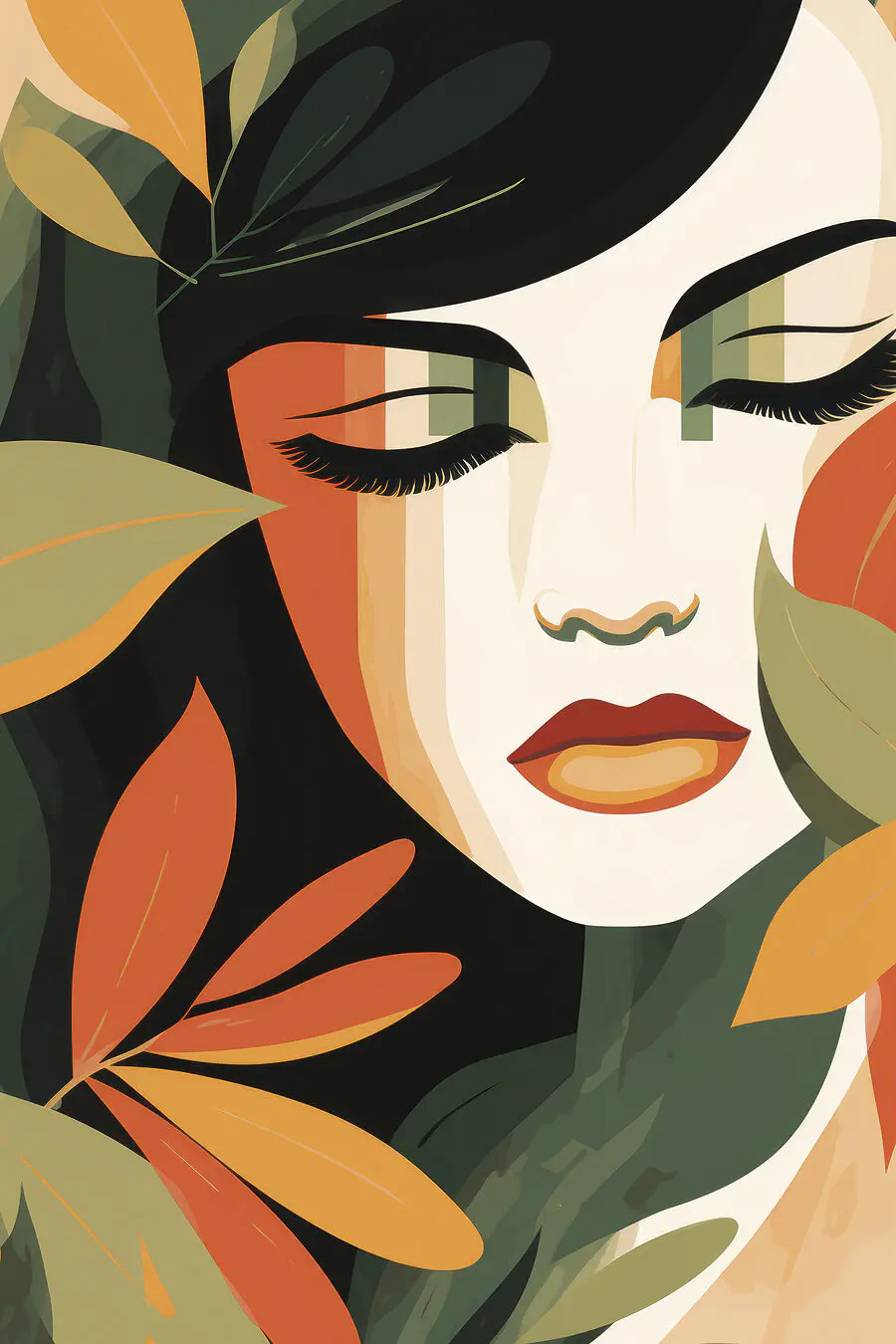 Vászonképek Nő csukott szemmel és levelekkel az arca körül
