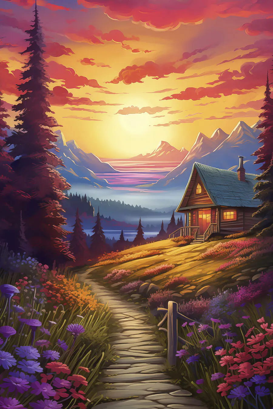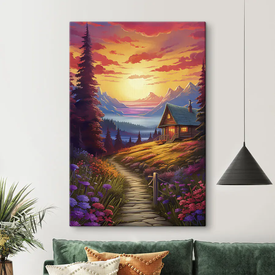 Vászonképek Ház egy dombon virágokkal és hegyekkel a háttérben