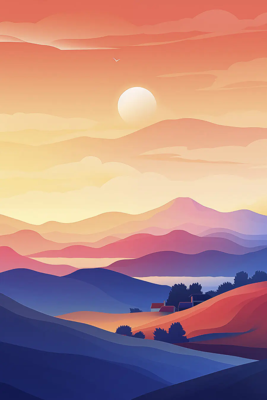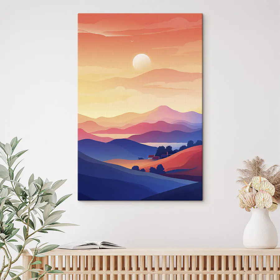Dreaming of a mountain retreat? This "Landscape of Mountains and a House" canvas print might just whisk you away to that serene escape, every time you glance at your wall. Imagine this: a cozy evening, your favorite hot drink in hand, and a breathtaking sunset over rolling hills—right in your living room. It's like wrapping your space in a warm, colorful hug. Perfect for nature lovers or anyone who needs a quick mental getaway during a busy day. The colors practically sing, blending vibrant tones with soft hues, making it feel like actual warmth is radiating from those painted hills. Hang it in your office, and let those pesky Monday blues drift away with the last of the evening light. One glance, and you'll hear the whisper of mountain breezes. Who knew peace could be delivered in a canvas?