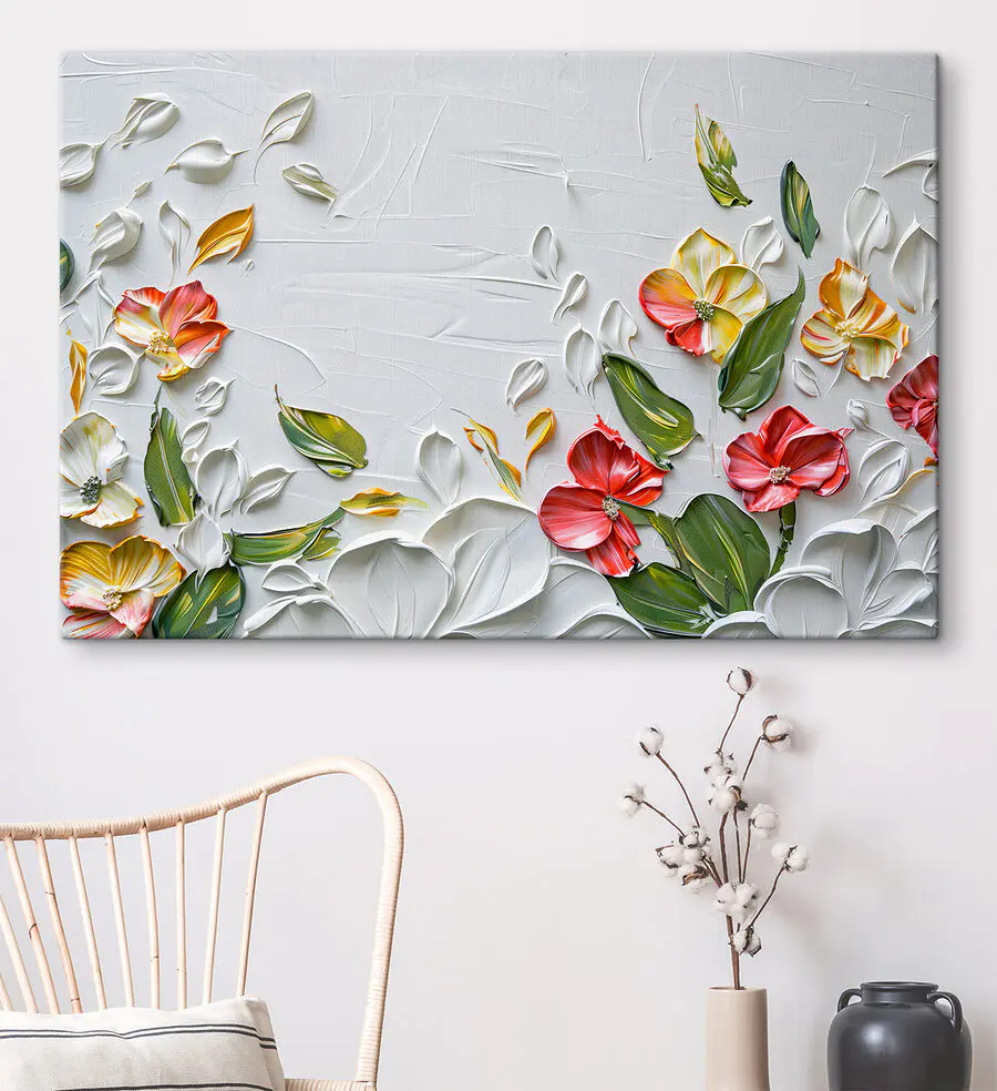 Képzelje el, hogy belép egy szobába, és úgy érzi, mintha egy friss tavaszi reggelre lépne be. Ezt hozza el ez a "Virágok és levelek vászonnyomtatású festménye" bármelyik térbe. Olyan, mintha egy csokrot tartanál a kezedben, amely soha nem hervad el - a virágok a színek és textúrák lágy szellőjében táncolnak. Tökéletes, hogy életet csempésszen az unalmas sarkokba! Akassza fel a nappalijába, és lehet, hogy minden egyes pillantásakor mosolyogni fog. Egy kis varázslatot suttog, nem gondolod? Vidám hangulatot áraszt, amely feldobja a hangulatot - olyan, mint egy vizuális ölelés.