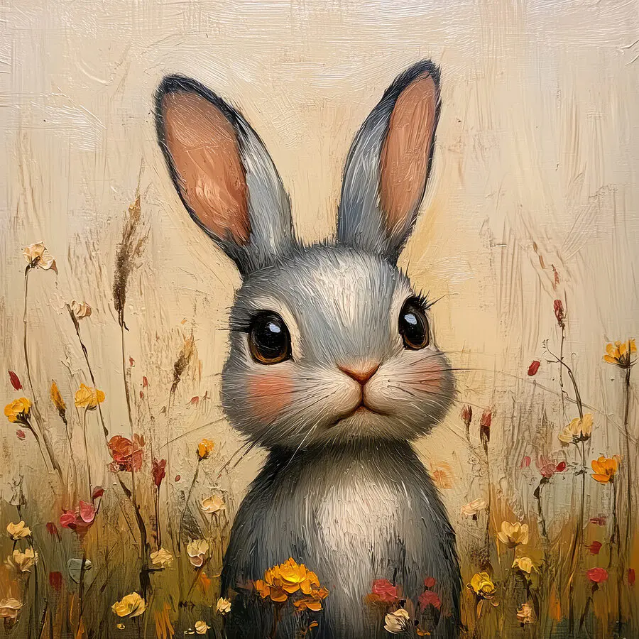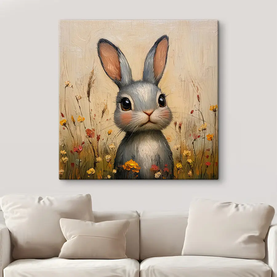 Képzeld el, hogy egy álomszép mezőt bámulsz, a napcsókolta virágokat lágyan ringatja a szellő - egy kíváncsi kis nyuszi leselkedik elő, szinte mintha meghívna téged, hogy csatlakozz a titkos világához. Ez a vászonnyomat olyan, mintha egy mesekönyv elevenedne meg, szeszélyes bájt kölcsönözve bármelyik szobának. Tökéletes egy hangulatos sarokba vagy a kandalló fölé, biztosan mosolyt csal a vendégek arcára és fantáziát ébreszt. A meleg és hívogató színekkel talán még a gondjaidat is elfelejted, és álmodozol egy kicsit - ez a varázslat lóg a faladon.