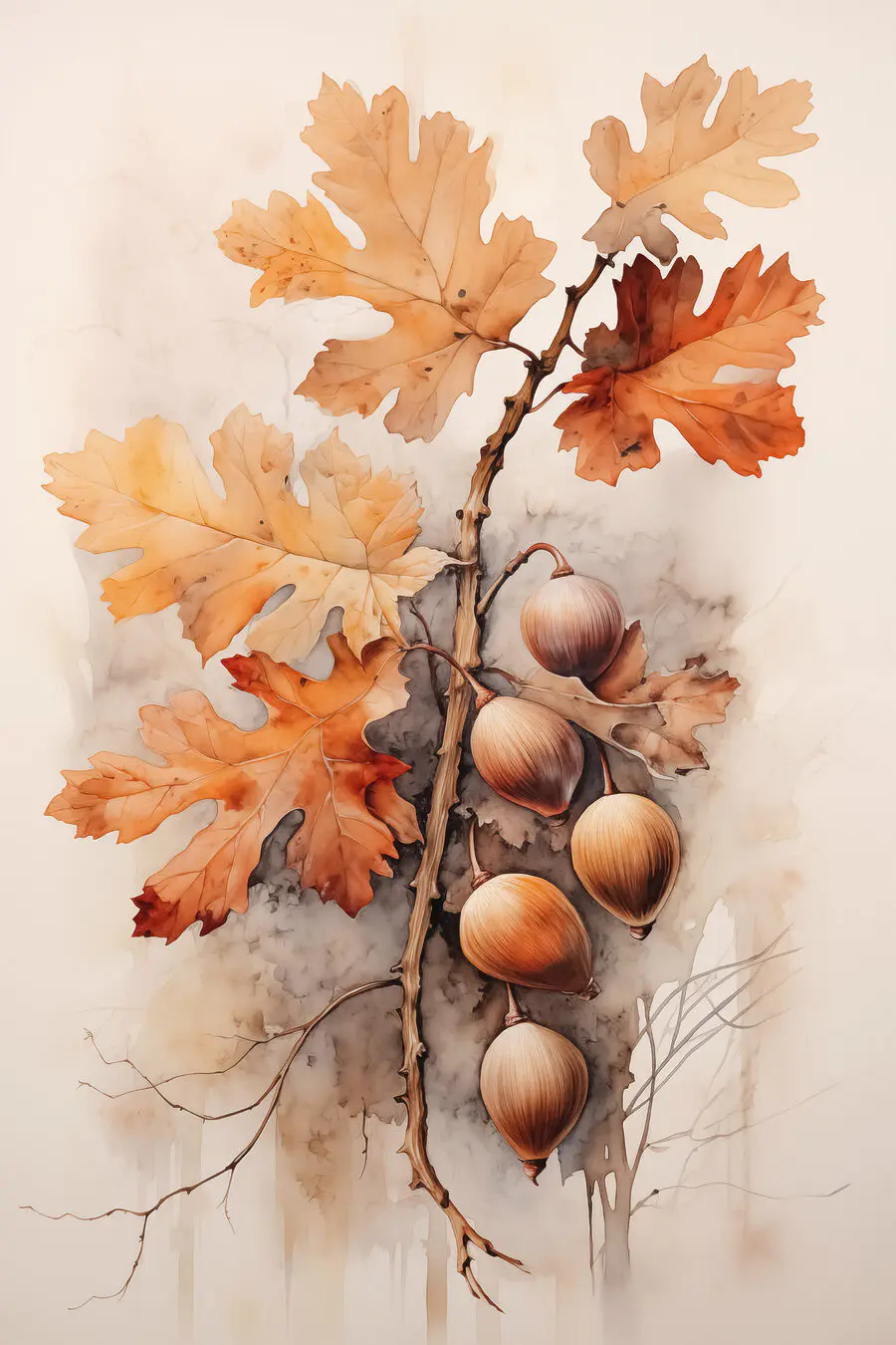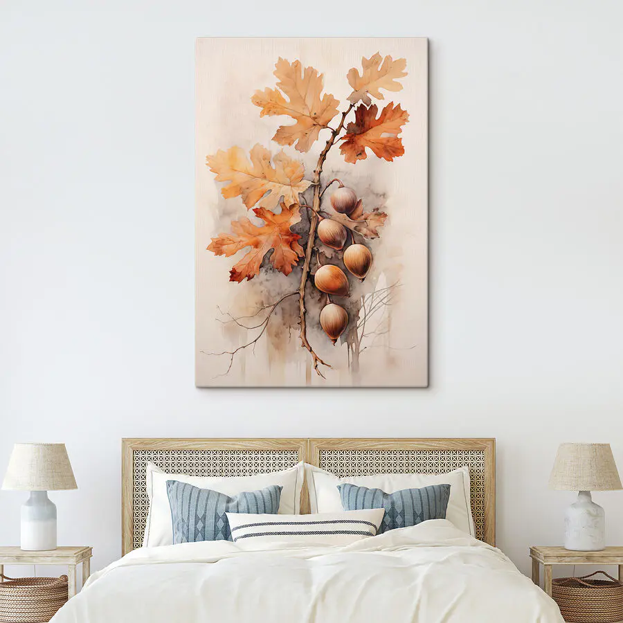 Vászonképek Makkok és levelek egy ágon fehér háttérrel