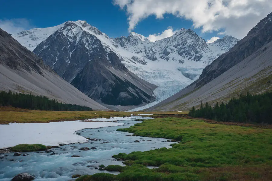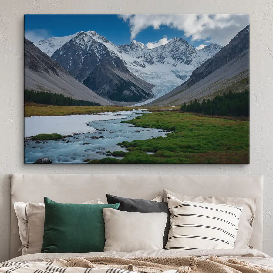 Vászonképek Folyó folyik keresztül egy völgyben, hófödte hegyek között