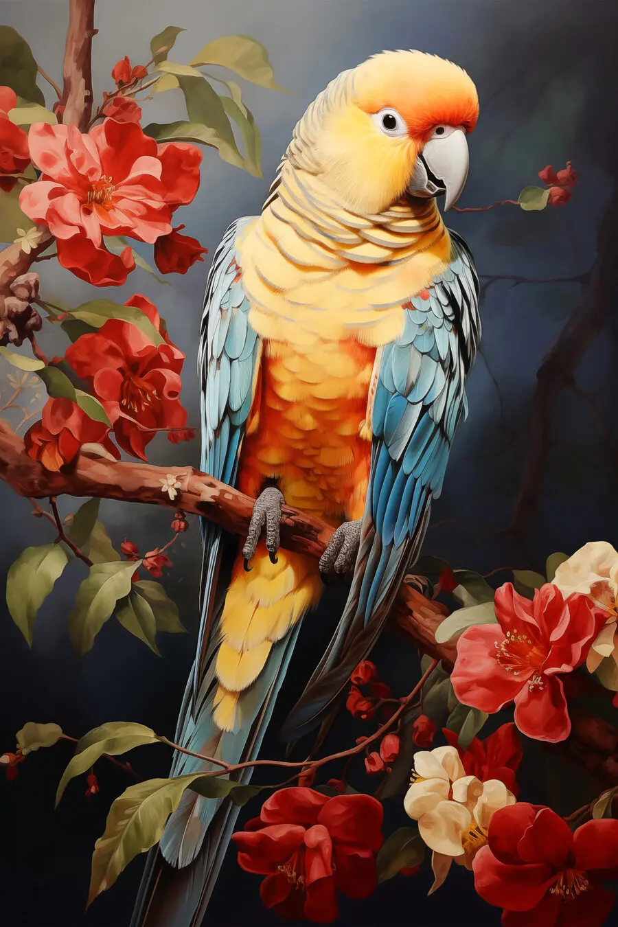 Vászonképek Színes madár ül egy ágon virágokkal