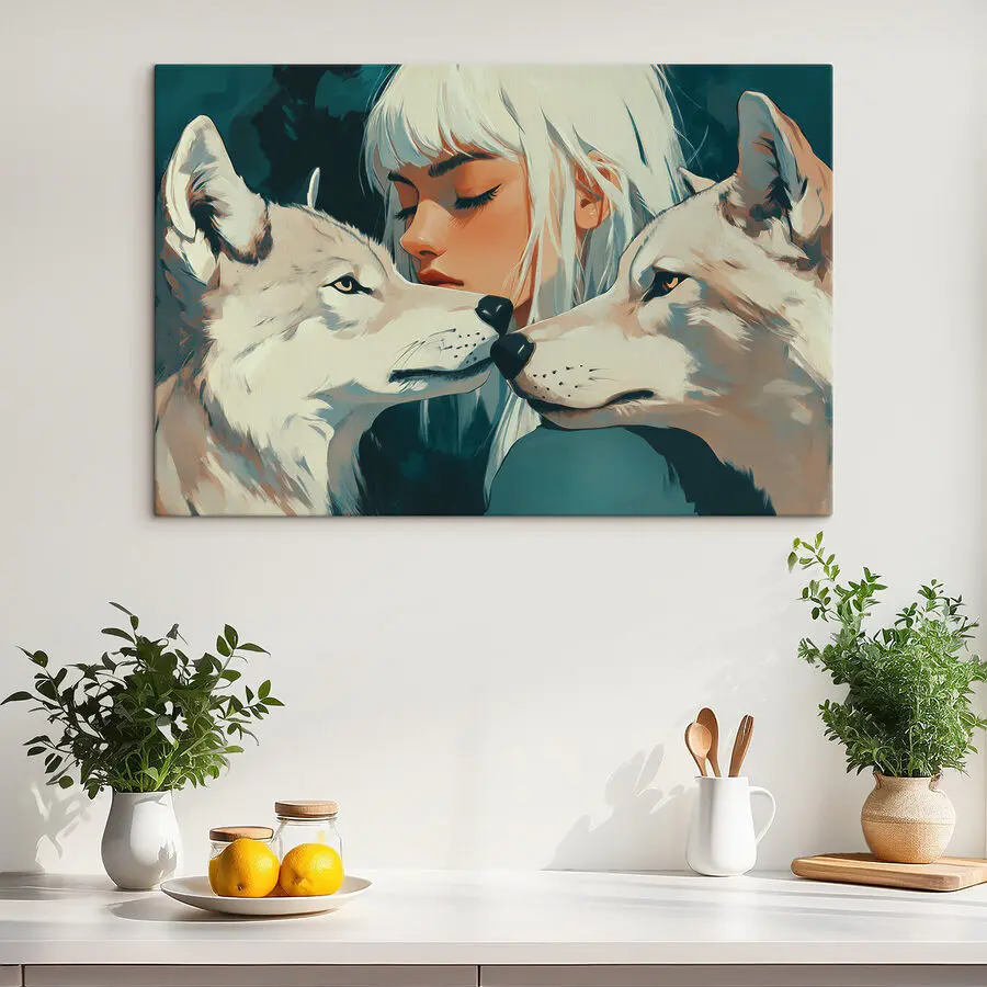 Vászonképek Fehér hajú nő és két farkas