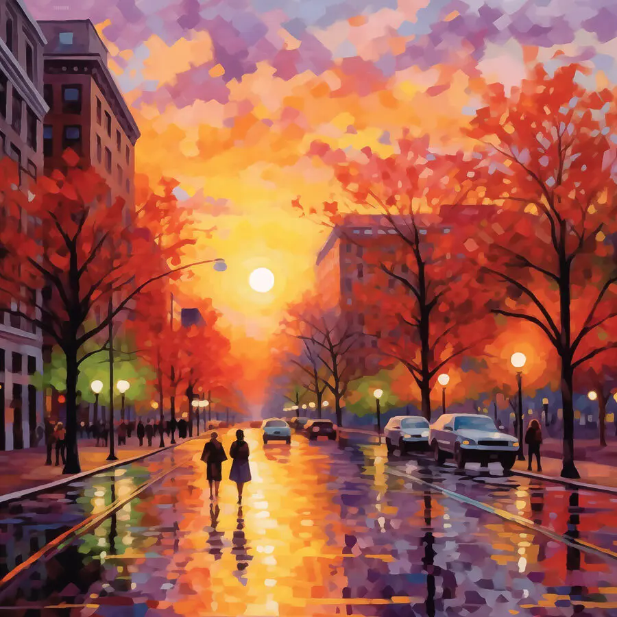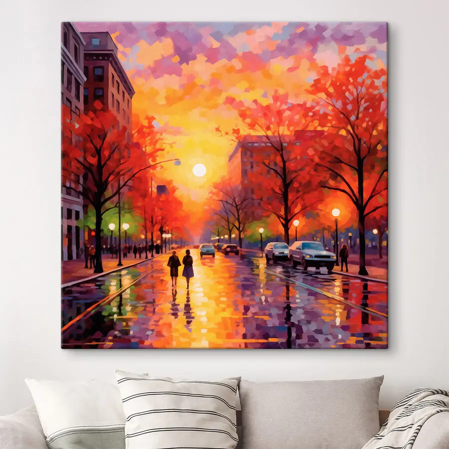 Bármelyik falat hangulatos meneküléssé varázsolhatod ezzel a vászonnyomtatással, amely egy lenyűgöző utcai jelenetet ábrázol, amely a szemet gyönyörködtető látványt nyújt. Képzelje el, amint egy vibráló sugárúton sétál, ahol a tüzes őszi színekben pompázó fák és a lágy, aranyszínű fény adja meg a hangulatot. Mintha egy szívmelengető történet tökéletes háttere lenne, ahol minden sarkon nevetés és élet bontakozik ki. Ez a darab a szívünkhöz szól, emlékeztetve minket a mindennapi pillanatok szépségére. Tökéletes olyan terekbe, amelyeknek szükségük van egy kis színre és melegségre, hogy minden napot egy kis kalandnak érezzünk. Tökéletes beszélgetésindító? Abszolút!