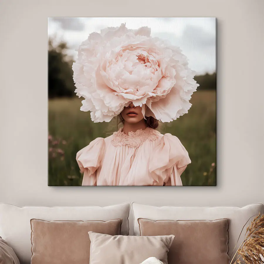 Vászonképek Ruhás nő nagy virággal az arca felett