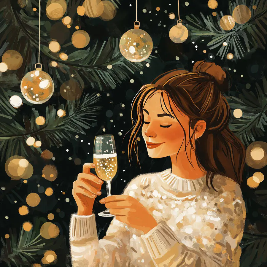 Vászonképek Nő egy pohár pezsgővel a kezében a karácsonyfa alatt