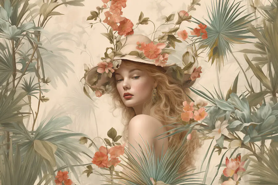 Vászonképek Nő kalapban, virágokkal körülvéve