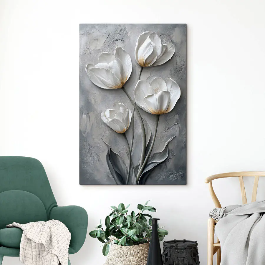 Hozzon egy kis friss levegőt bármelyik szobába ezzel a lenyűgöző, fehér virágokat ábrázoló vászonnyomtatással. Úgy tűnik, minden egyes virág táncol a lágy szürke háttér előtt, és a kerti sétákról és napsütéses délutánokról való álmodozásra hív. Képzelje el, ahogy leheveredik a kanapéra, egy csésze meleg teával a kezében, és elveszik a finom szirmokban, amelyek szinte tapinthatónak tűnnek. Ideális azokhoz a pillanatokhoz, amikor a természetet szeretné a beltérben megidézni, az öntözéssel járó gondok nélkül. Ez a darab nem csak díszít; nyugalmat és békességet sugároz, így tökéletes egy hangulatos zugba vagy egy élénk élettérbe. Ennek a nyomatnak a hozzáadása kicsit olyan érzés, mintha a természet lenne az új szobatársad - a rendetlenséget leszámítva!
