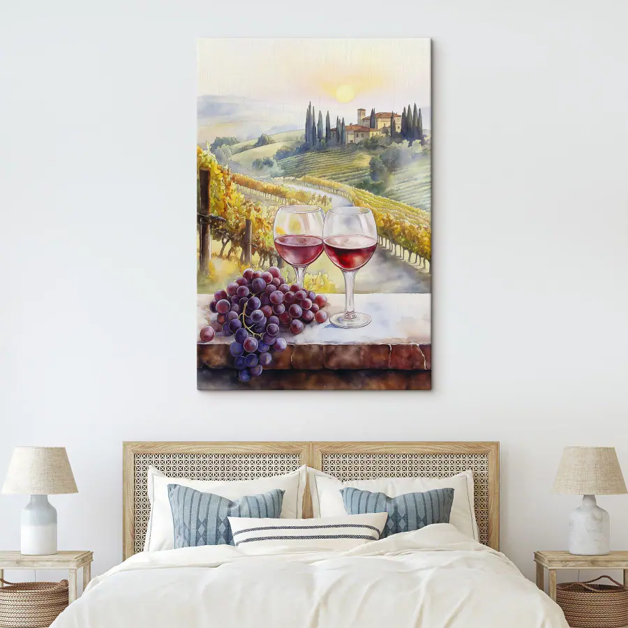 Képzelje el, hogy belép egy napsütötte szőlőskertbe, ahol nevetés és pohárcsilingelés tölti be a levegőt. Ez a lenyűgöző, borospoharakat és zamatos szőlőt ábrázoló akvarell vászonnyomat tökéletesen megragadja ezt az álomszerű hangulatot. A lágy színek és a gyengéd vonások elrepítik Önt egy nyugodt menekülésbe, egyenesen a nappalijába. Akár a barátaiddal kortyolgatod a kedvenc borodat, akár egyedül lopsz egy csendes pillanatot, ez a kép bájt és melegséget kölcsönöz bármely helyiségnek. Olyan, mint egy kis emlékeztető, hogy élvezd az élet jó dolgait - a sajtot, a barátokat és talán egy kis vöröset. Hagyja, hogy ez a darab örömet okozzon és hangulatos összejöveteleket inspiráljon. Egészségünkre!