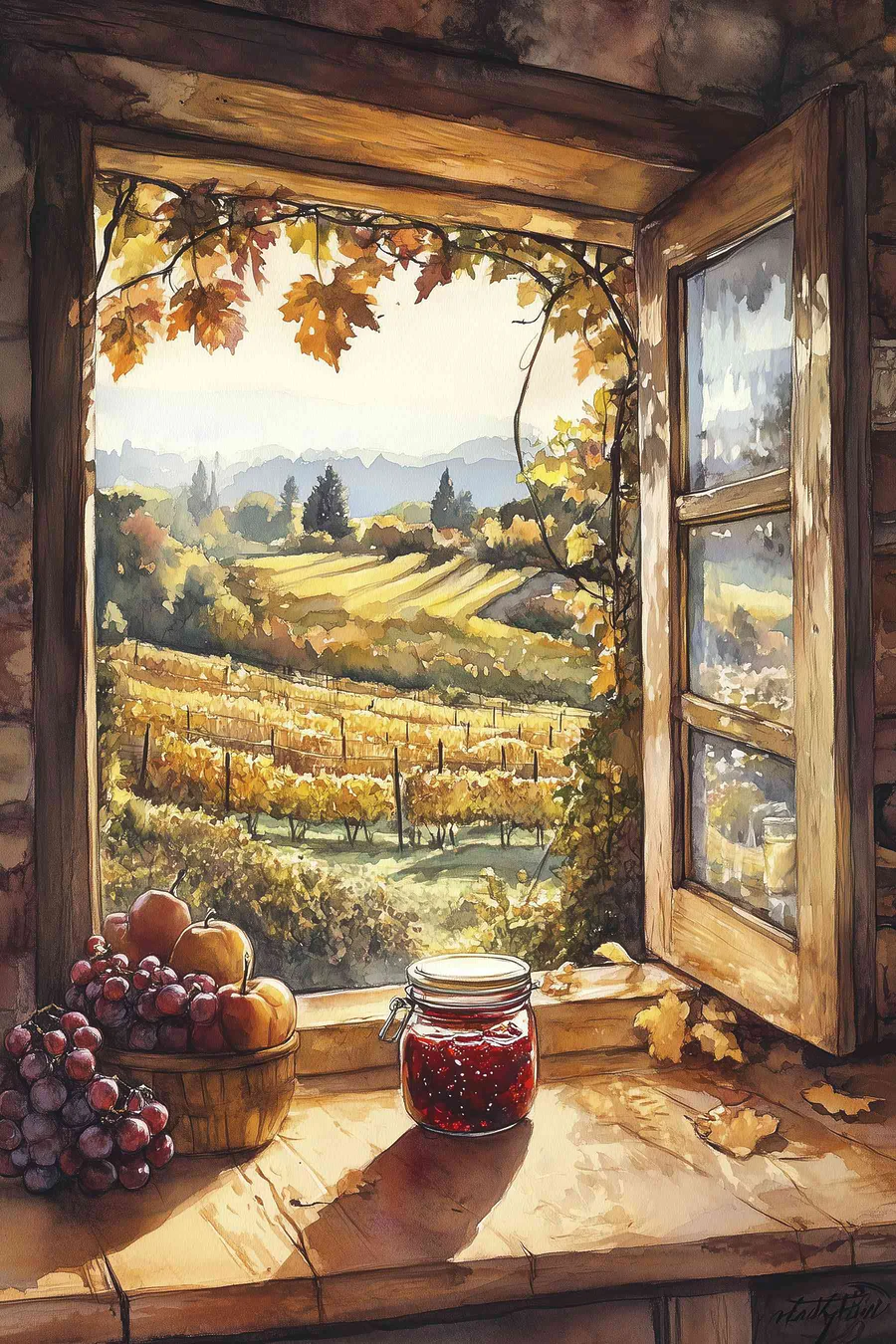 Vászonképek Ablak, kilátással egy szőlőskertre és egy üveg lekvárral