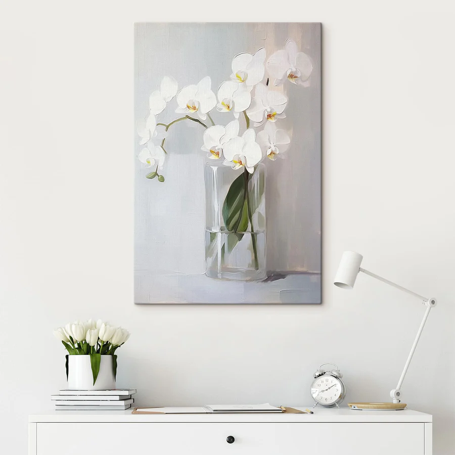 Vászonképek Festmény egy fehér orchidea üvegvázában