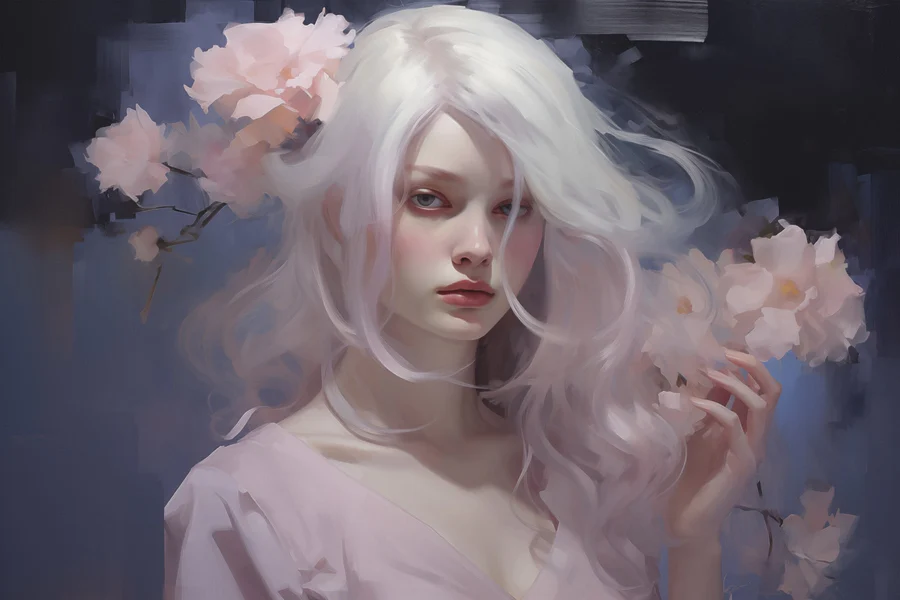 Vászonképek Nő hosszú fehér hajjal és rózsaszín virágokkal