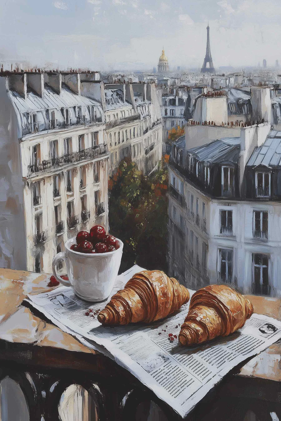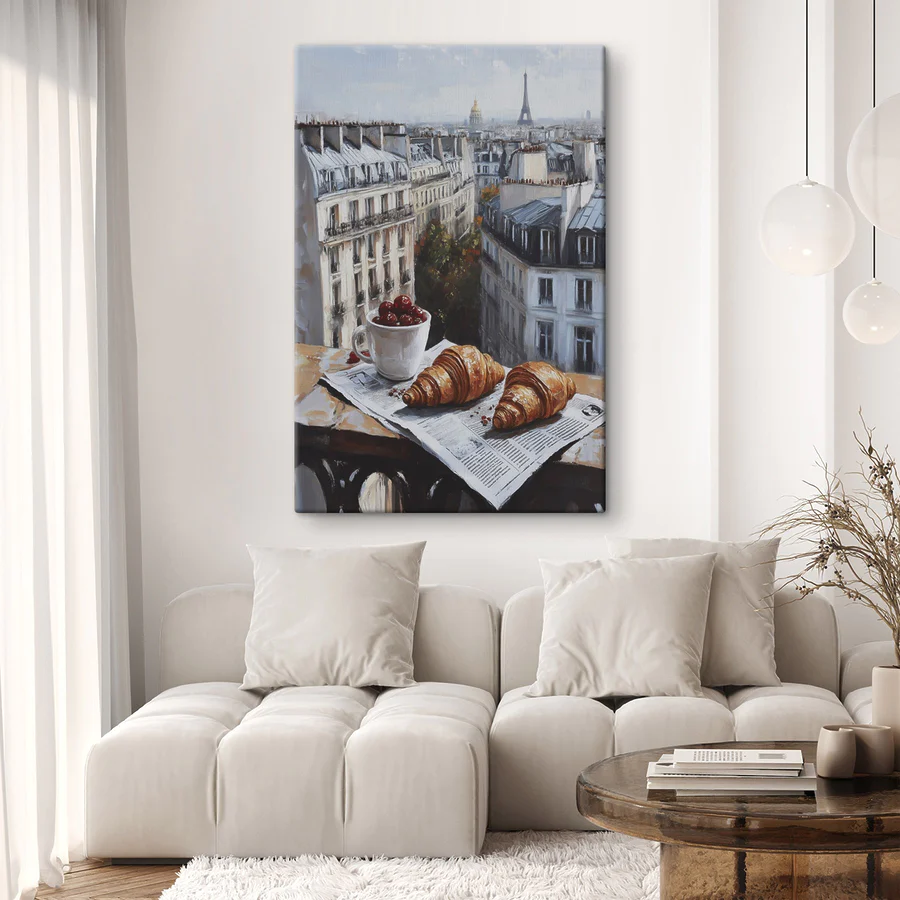 Vászonképek Egy csésze kávé és croissant egy asztalon, a háttérben épületekkel