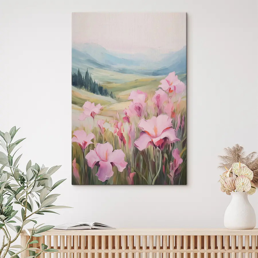 Vászonképek Rózsaszín virágok festménye egy mezőn
