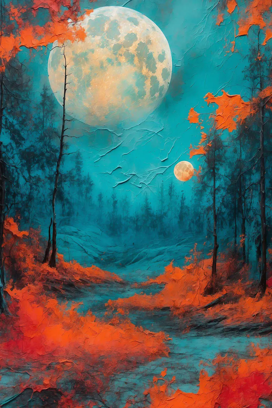 Vászonképek Festmény egy erdő narancssárga levelekkel és teliholddal